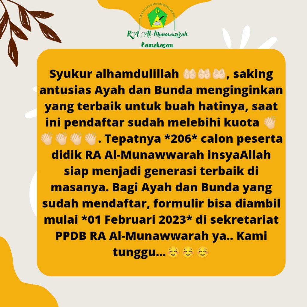 Syukur alhamdulillah 🤲🏻🤲🏻🤲🏻, saking antusias Ayah dan Bunda menginginkan yang terbaik untuk buah hatinya, saat ini pendaftar sudah melebihi kuota 👏🏻👏🏻👏🏻👏🏻👏🏻. Tepatnya 206 calon peserta didik RA Al-Munawwarah insyaAllah siap menjadi generasi terbaik di masanya. Bagi Ayah dan Bunda yang sudah mendaftar, formulir bisa diambil mulai 01 Februari 2023 di sekretariat PPDB RA Al-Munawwarah ya.. Kami tunggu…☺️☺️☺️