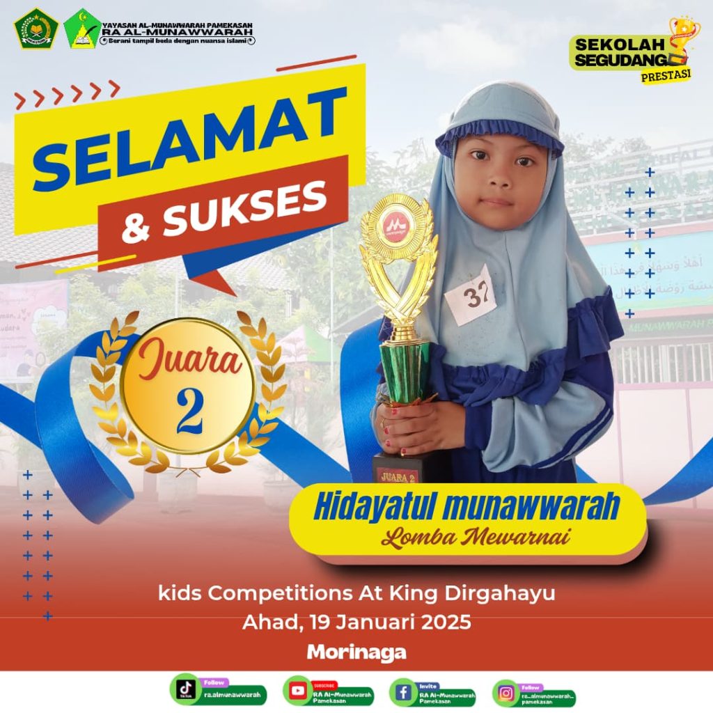 Alhamdulillah RA Al-Munawwarah kembali mengukir prestasi dalam bidang lomba mewarnai, selamat untuk ananda Hidayatul Munawaroh dan Nadhifah Syahdana Arif atas prestasinya.