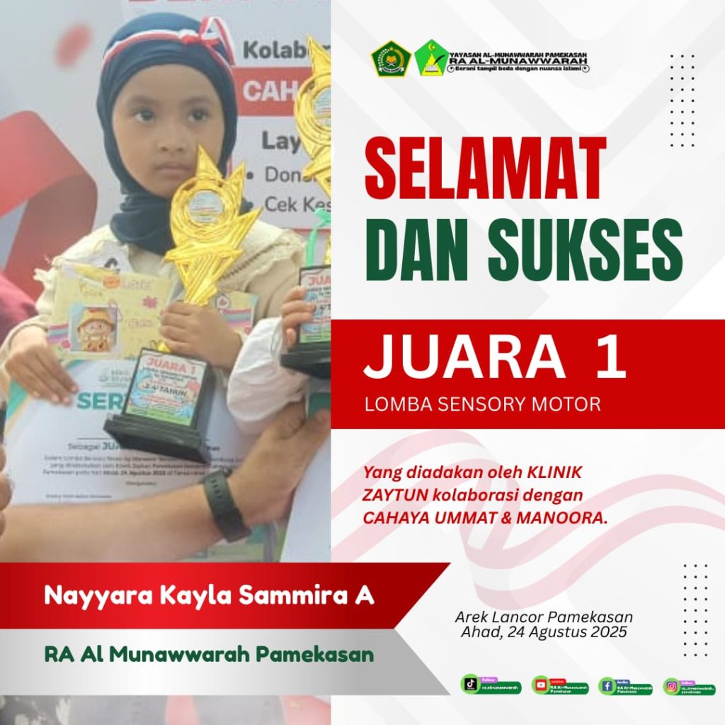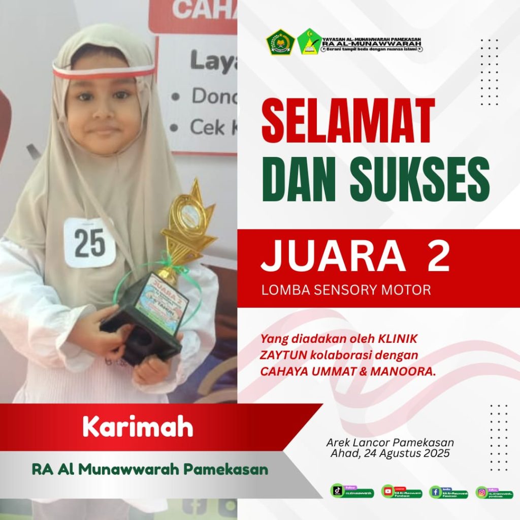 Alhamdulillah lagi2 siswa RA Al-Munawwarah kembali mengukir prestasi, kali ini ananda Nayyara Kayla Sammira A dan ananda Karimah mendapatkan Juara 1 dan Juara 2 Lomba Sensory Motor yang diadakan oleh Klinik Zaytun pada hari Minggu tanggal 24 Agustus 2025.