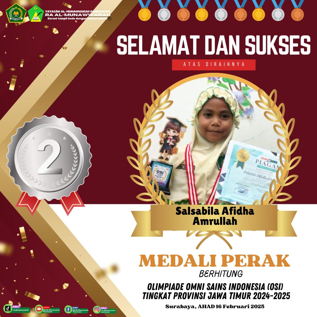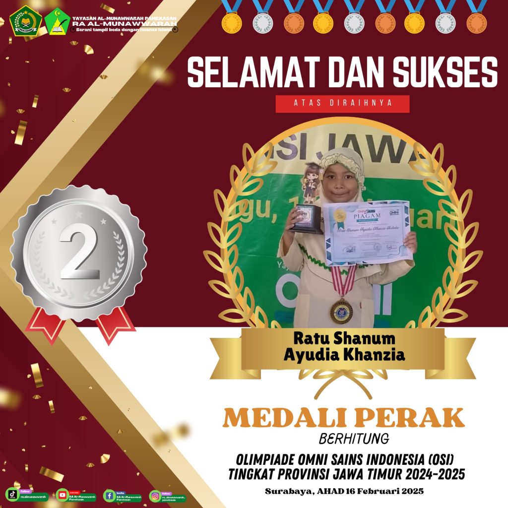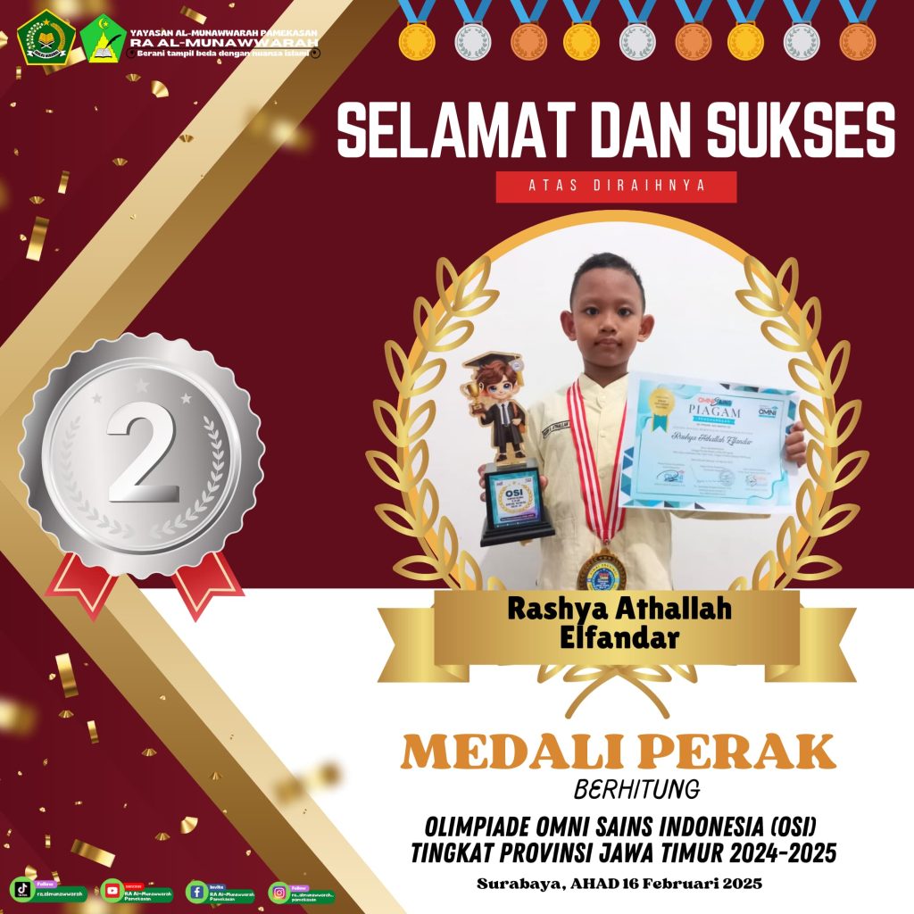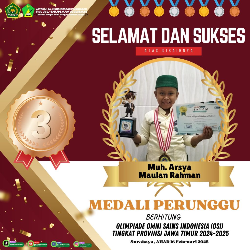Alhamdulillah untuk kesekian kalinya RA Al-Munawwarah kembali mengukir prestasi dengan diraihnya beberapa kejuaraan OSI di babak penyisihan tingkat Provinsi Jawa Timur yang dilaksanakan pada hari Ahad tanggal 16 Februari 2025 di Surabaya tepatnya di SMK N 1 Surabaya.