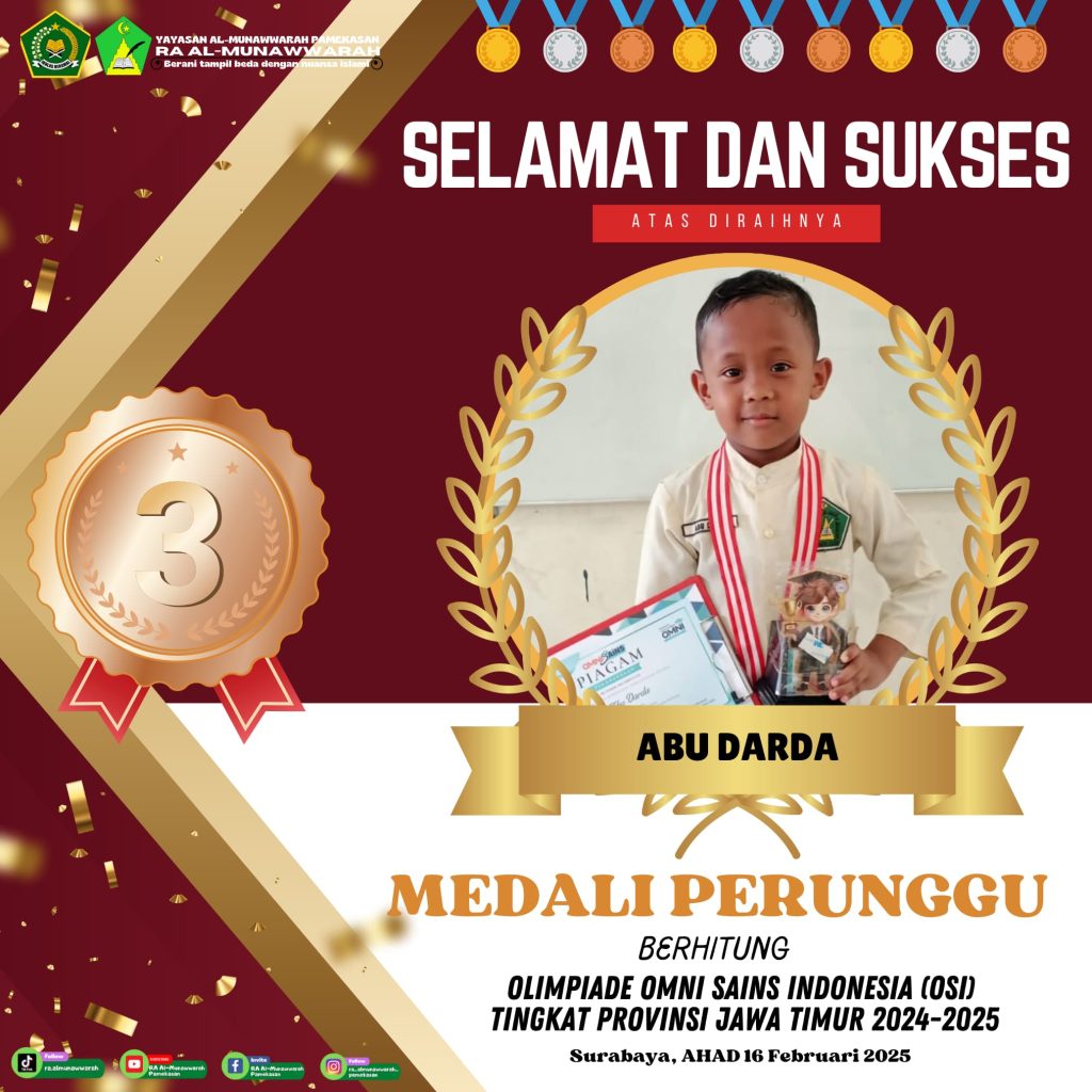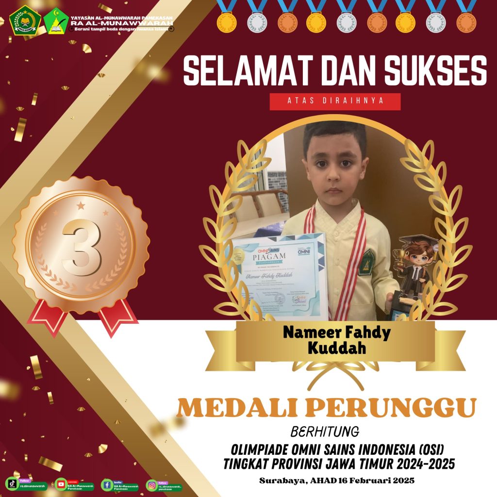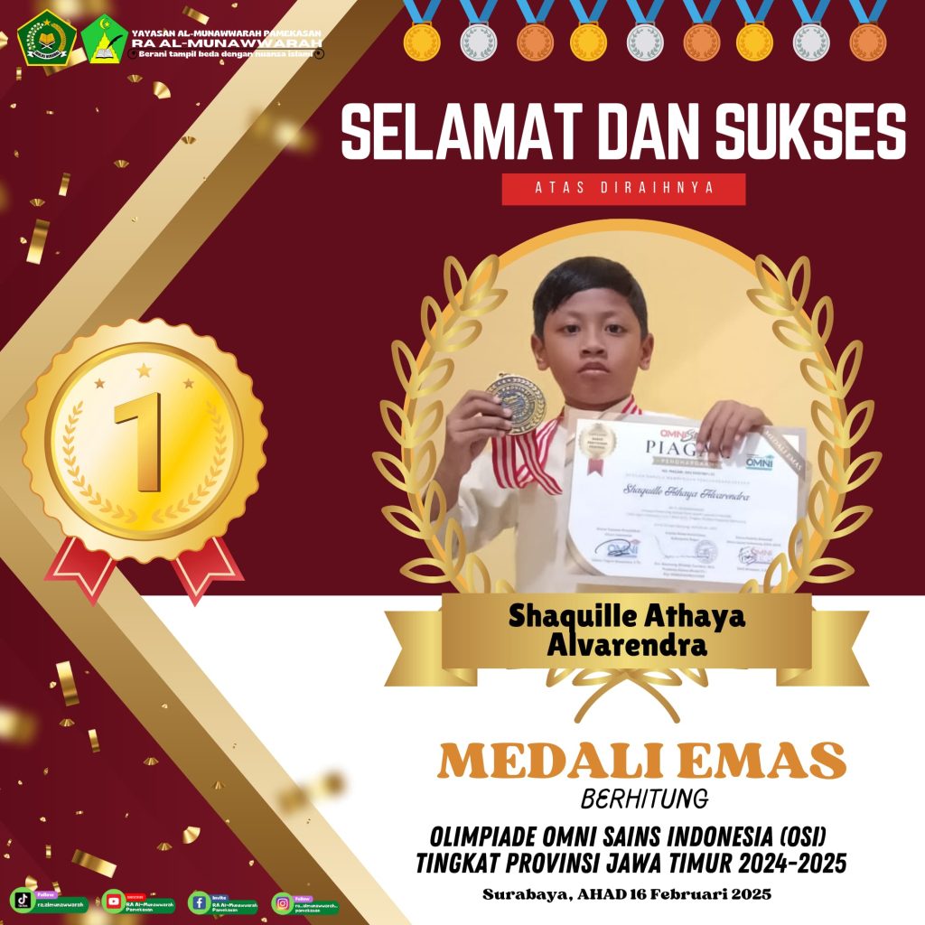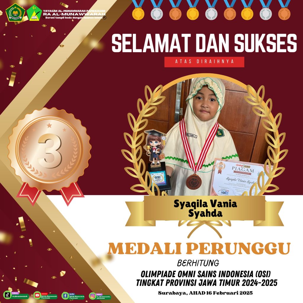 Alhamdulillah untuk kesekian kalinya RA Al-Munawwarah kembali mengukir prestasi dengan diraihnya beberapa kejuaraan OSI di babak penyisihan tingkat Provinsi Jawa Timur yang dilaksanakan pada hari Ahad tanggal 16 Februari 2025 di Surabaya tepatnya di SMK N 1 Surabaya.