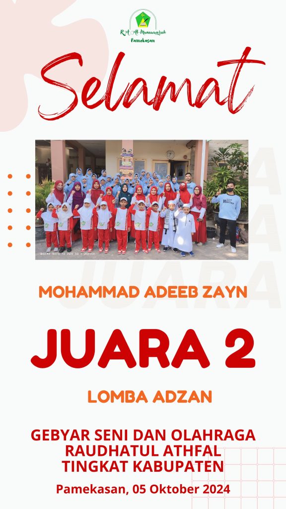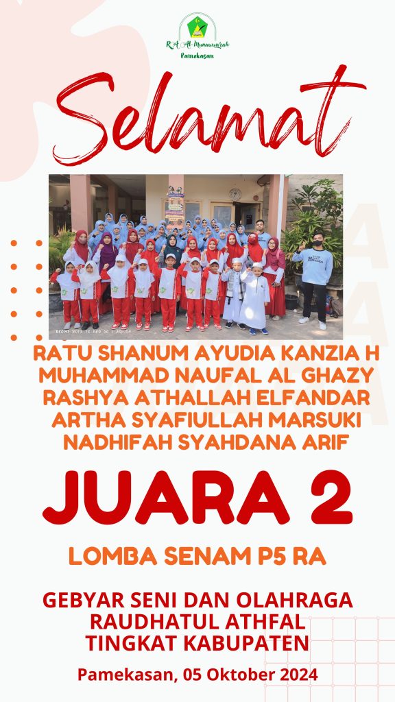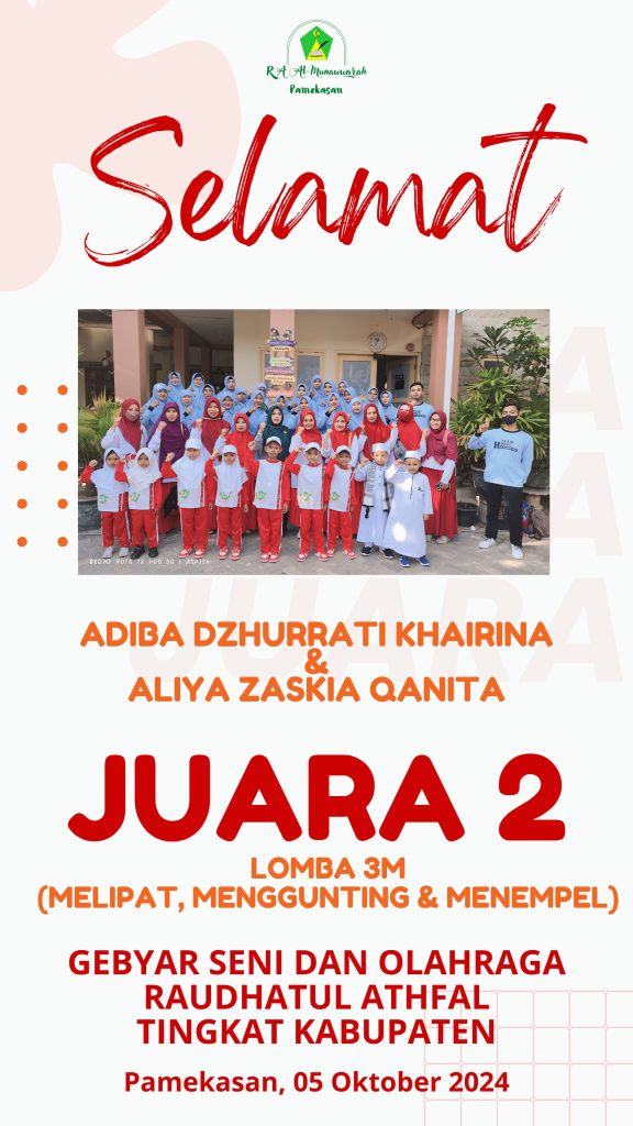pada gelaran GELORA yang diadakan PD IGRA KAb. Pamekasan pada hari Sabtu tanggal 05 Oktober 2024 RA Al-Munawwarah kembali meraih kejuaraan pada 3 macam perlombaan yaitu Juara II Lomba Senam P5RA, Juara II Lomba Adzan dan Juara II Lomba 3M.