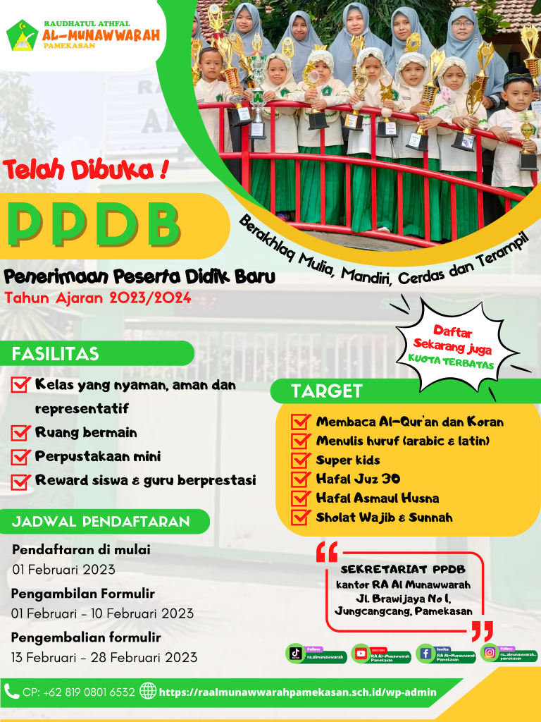 Yupz,,, RA Al-Munawwarah adalah pilihan terbaik untuk masa depan si kecil..Tahun Ajaran 2023-2024, RA Al-Munawwarah Pamekasan telah membuka pendaftaran dari tanggal 01 Februari 2023 sekaligus pengambilan formulir.