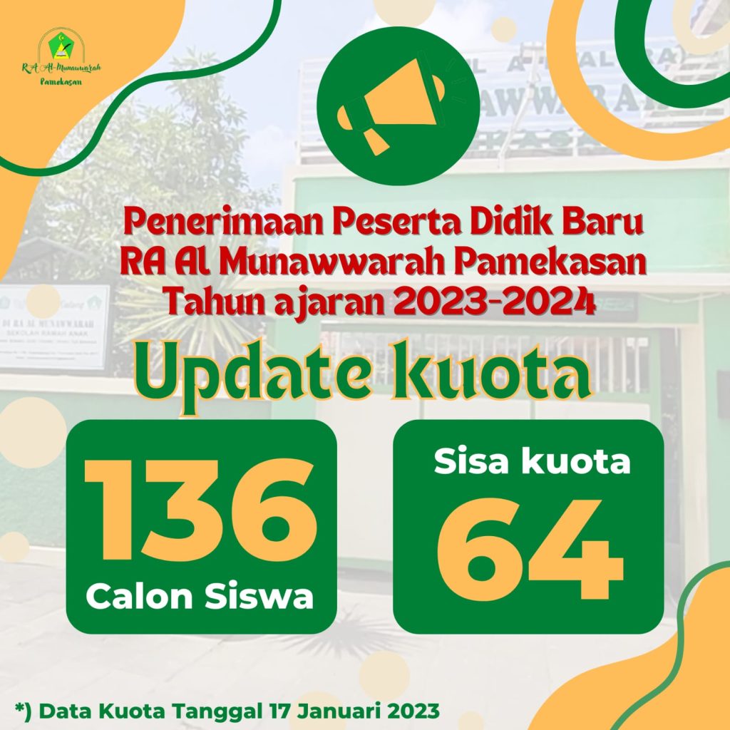 Alhamdulillah sampai hari ini calon siswa RA Al Munawwarah Tahun Ajaran 2023-2024 sudah 136 calon peserta didik.